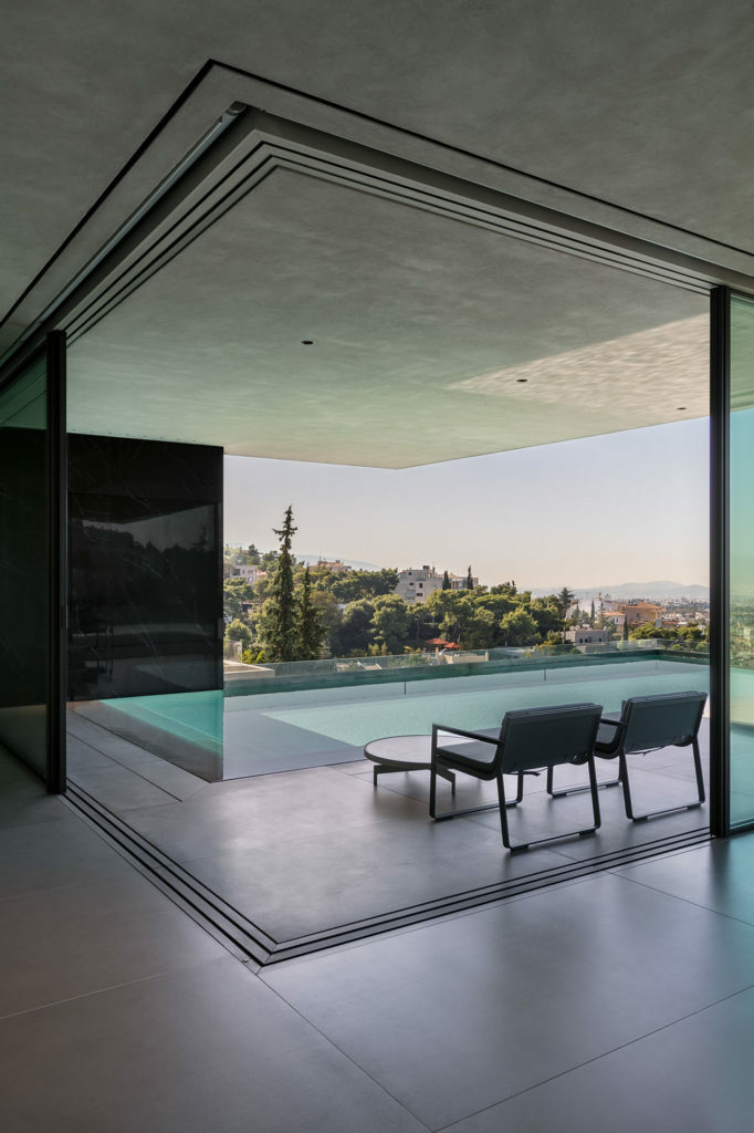 Бесшовное слияние внешнего и внутреннего. Окна скользят по щели шириной 1 см в полу. Пространство между дорожками покрыто таким же напольным покрытием, что создает сплошное пространство.
